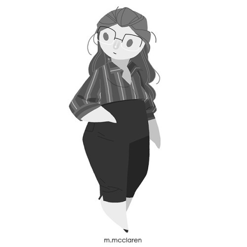 [Description: A black and white cartoon version of myself. I am wearing high waisted dark pants and a dark striped blouse.]