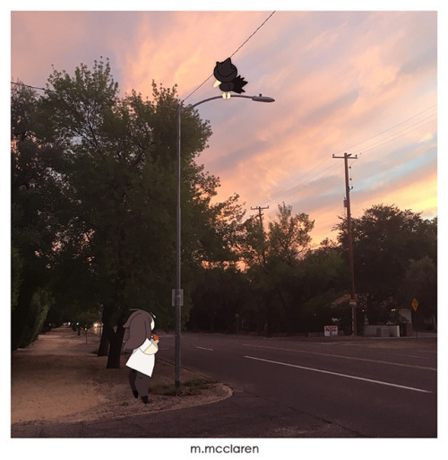 [Description: A photo beside the road. A cartoon version of myself is standing underneath a street light. I am looking up at a Murkrow from Pokemon, which is sitting on top of the light.]