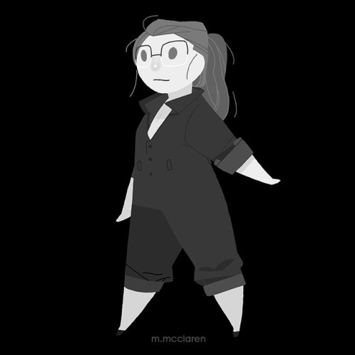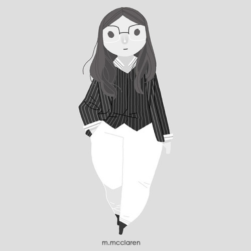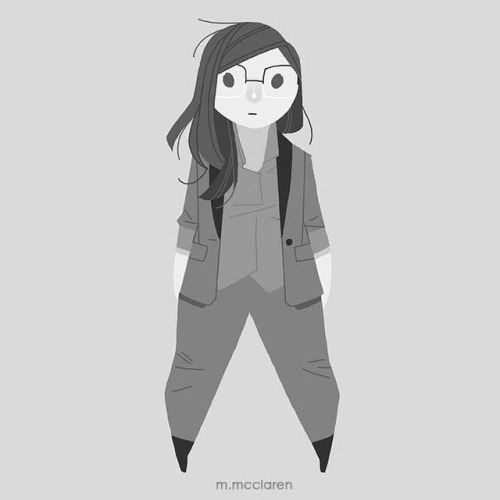 [Description: A cartoon version of myself in black and white, wearing a grey suit, shirt, and black boots. My hair is over one shoulder.]