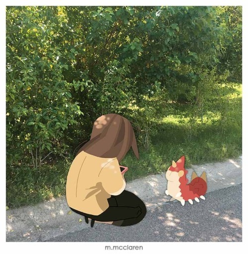 [Description: A cartoon version of myself kneeling on the curb in front of a Wurmple from Pokemon. I am facing away from the audience holding my pink phone, with my brown hair down, wearing a yellow button up and dark jeans. Beside the curb is some grassy overgrowth.]
