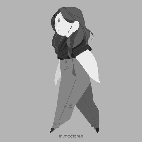 [Description: A black and white cartoon version of myself in profile walking towards the audience left. I have dark boots, lighter high waisted pants, a dark top and my hair is down.]