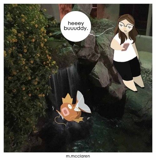 [Description: A photo of a small manufactured waterfall. A cartoon version of myself is leaning against the rocks. I am wearing a white shirt, black pants, black slippers, and my brown hair down. I am also holding my pink iphone. I am looking down at the pokemon Magikarp, which is flopping in the waterfall’s pool.]