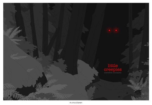 [Description: An illustration of a darkened forest path. Little hills to the side of the path get lighter towards the right and left edges of the illustration, but not by much. Above the darkened path is a pair of glowing red eyes and the text ‘Little Creepies Meredith McClaren.]