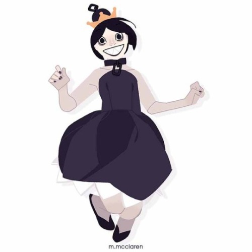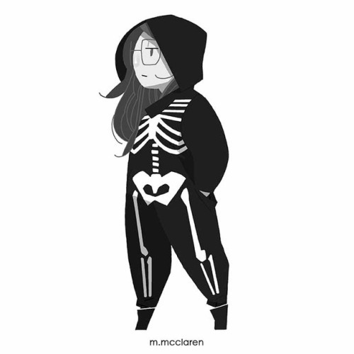 [Description: A cartoon illustration of myself. I look bored. I am wearing a skeleton jumpsuit with a hood, black booties, and my hair is down.]