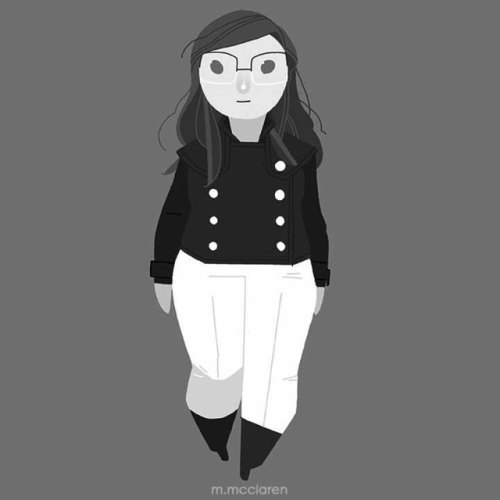 [Description: A black and white cartoon version of myself. I am wearing my hair down, with a white buttoned dark jacket, white pants, and dark boots.]