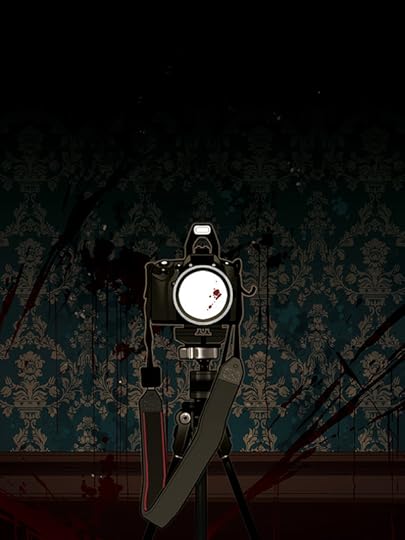 Description: A dark illustration of a camera set up on a tripod. Behind it is flowery wallpaper streaked with dark stains, suggesting blood. The camera faces the audience, the implication that it is documenting whatever violence is going on, while a few drops of blood sit on the lens.