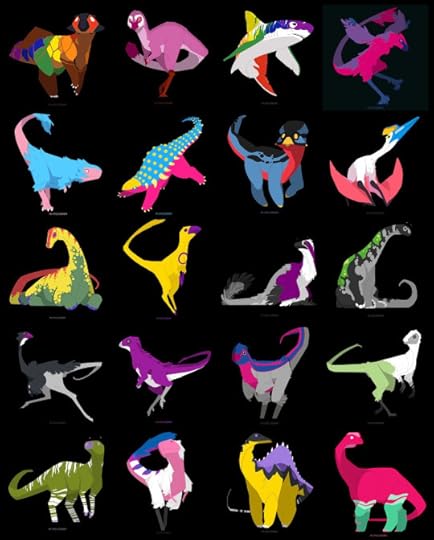 [Description: Various dinosaurs colored in accordance with different pride flags atop a black background. More detailed descriptions below the cut]