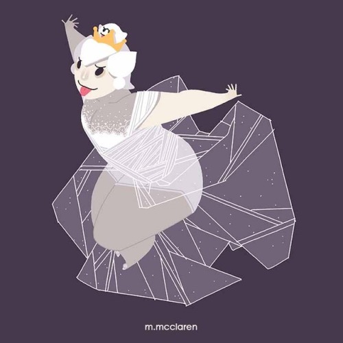 [Description: A girl in mid jump. Her legs are tucked under her and her arms are bent outward. She is wearing a dark grey dress and slippers, white gloves, and a yellow crown. Her bangs cover her right eye.]