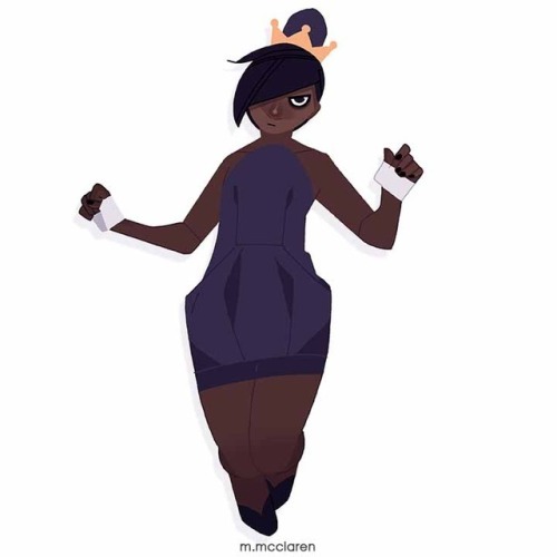 [Description: A girl jumping in the air with her arms bent and her feet tucked behind her. She has black hair, wide black eyes, and a big grin with sharp teeth. She is wearing a strapless black dress with white triangles lining the bottom like Chain Chomp teeth. She is also wearing a choker and crown. Each has a single chain link. And black slippers.]