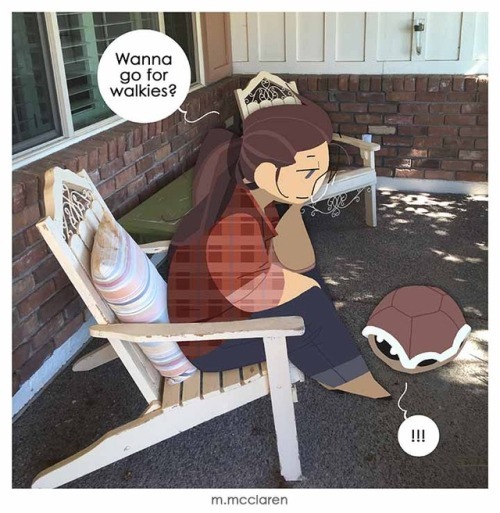 [Description: A photo of a houses front patio. There are two faded yellow chairs and a green coffee table. Drawn sitting in the closest chair is a chibi version of myself. I am leaning forward with my chin resting on my left hand. I am wearing rolled jeans, a red plaid shirt and my brown hair is tied in a pony tail. At my feet is a Squirtle shell from Pokemon. There are two eyes peeking out of the shell’s opening.]