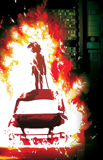 Description: An illustration of a city street at night. In the foreground is a car on fire. Shadowed by the flames is a person holding a sword, walking on top of the car.