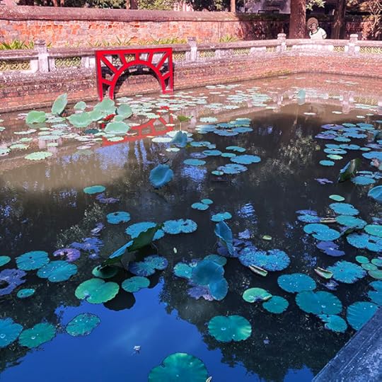 Description: A photo of a man made lily pad pond in Hanoi, Vietnam. This might of been at the Temple of Literature? Taken January 2024. There’s a small me illustrated in the back corner, looking at the pod.