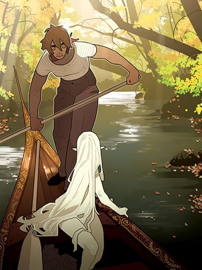 Description: An illustration of a forest river cast in warm tones. In the foreground is a gondola boat holding the rower and their passenger. The rower is a leaning down to smile at her passenger, while the passenger (clearly inhuman from her paleness and peeking pointed ears) looks back at her.