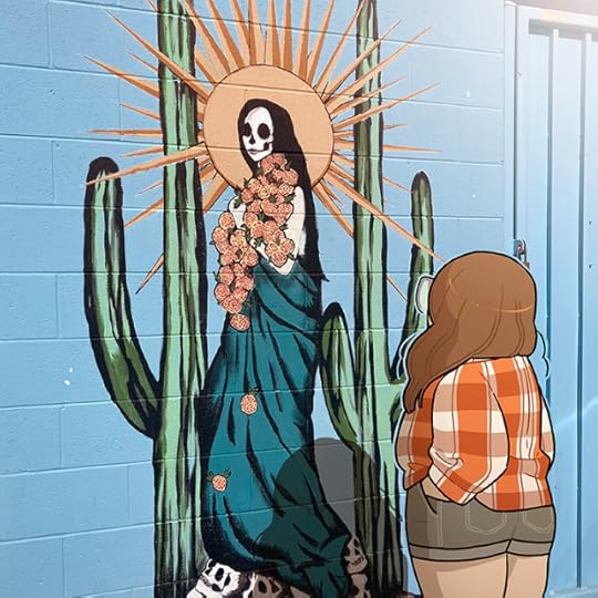 Description: A photo of a mural at Hotel McCoy in Tucson. The mural depicts a skeleton dressed as a woman, carrying a bundle of orange flowers. The sun shines behind them and two saguaro flank either side. An illustration of myself stands beside the mural, looking at it.
