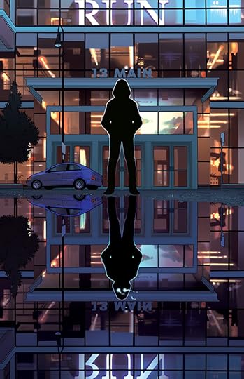 Description: An illustration of a building in dim blue light. The interior of the building contrasts with rooms warmly lit through the glass windows. At the top of the illustration, illuminated from inside the building is the word ‘Run.’ Outside, a figure stands dead center, looking at the camera. Beneath their feet, the entire picture is reflected in a pool of dark water. The only difference is that the figure in the reflected image has glowing eyes.