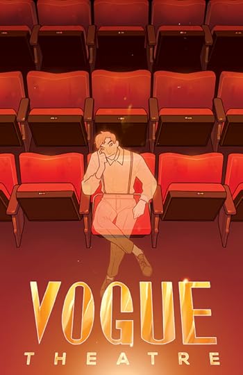 Description: A downward view of the rows of red seats of a theatre audience. Seated front and center is the nearly transparent figure of a man, sitting with his legs crossed and his head leaned against one hand. At his feet is the text ‘Vogue Theatre’.