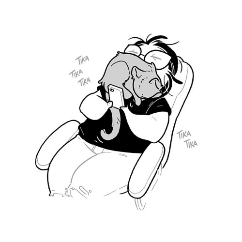 Description: A black and white illustration of me in my office chair. I am leaned all the way back so my cat can sleep on my lower face. I am trying to look over her to fiddle with my phone while she naps.