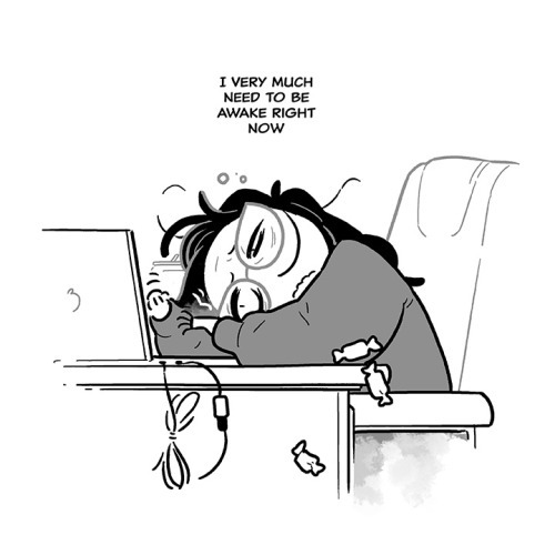 Description: A small black and white doodle of me at my desk. My head is down as I blearily eye my computer. I am shakily typing. Text reads: ‘I very much need to be awake right now.’ Alas. I am not.
