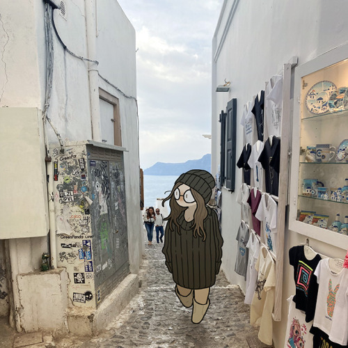 Description: A photo of a Santorini side street. Between the two buildings, an illustration is walking along.