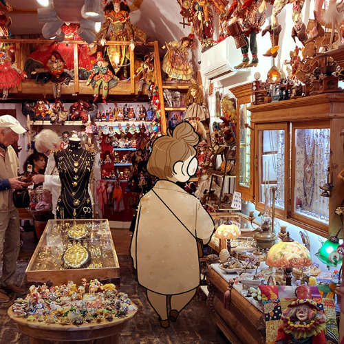 Description: A photo inside a trinket shop in Santorini, Greece. An illustration of myself in a long scruffy beige sweater is perusing the aisles.