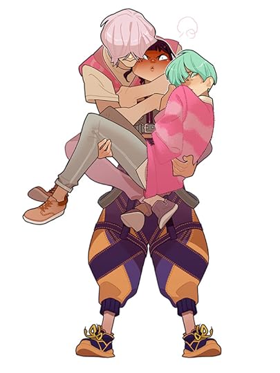 Description: An illustration of Zoey, Mystery, and Baby from KPOP Demon Hunters. Zoey is holding up the weight the two demons in their human forms. Baby in front, playing up his ‘I’m adorable’ facade. Mystery hanging off her back. She’s red faced and huffing as she carries them both.