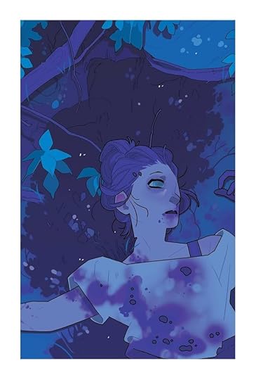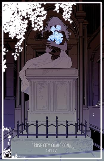 Description: A dark illustration cast in blues, purples, blacks and whites. It shows a crowded graveyard, particularly one podium front and center. At the top is a female figure, clutching bouquet of blue roses to their face. White leaves make up most of the top left and a few dots along the rest of the composition. Text reads ‘Rose City Comic Con, Sept 5-7.’