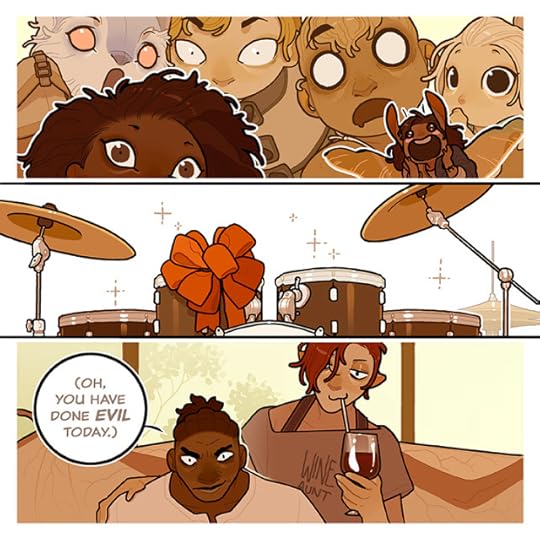 Panel 1: We have a close up of several fantasy children. They’re eyes wide and mouths agog. Whatever they’re looking at has their complete attention.