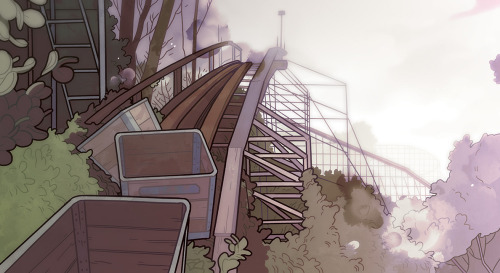 Description: An illustration of a run down, abandoned, overgrown roller coaster.