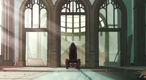 Description: An illustration of an abandoned throne room, cast in early morning light.