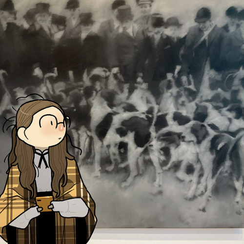 Description: A photo of a black and white painting by Gerhard Richter. The subject is a party of hunters and their dogs. In front of the painting is an illustration of myself, wearing a blouse, black skirt, and yellow plaid shawl.