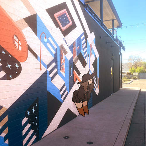 Description: A photo of a mural. An illustration of myself in a black dress and hat is leaning against the wall.