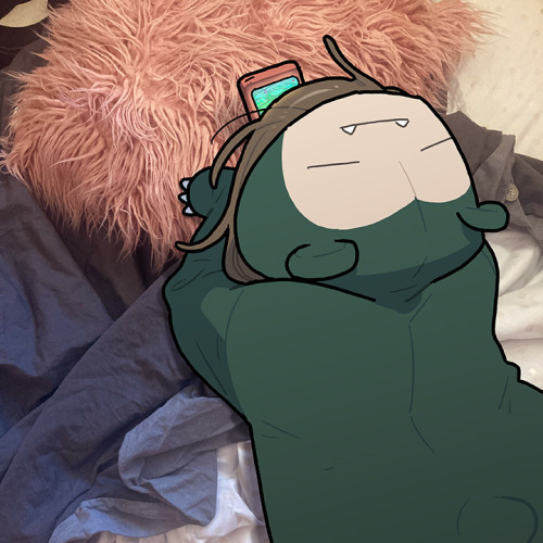 Description: A photo of my messy bed. An illustration of myself lies across the bed in a snorlax onesie. I am playing Pokemon Go.