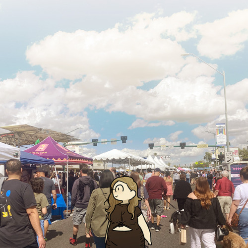 Description: A photo of a street fair. It’s well attended. An illustration of myself walks front in center of the crowd.
