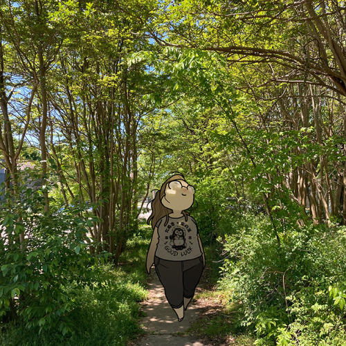 Description: A photo of a green, overgrown sidewalk. An illustration of myself walks under the branches in a grey Moshi Moshi shirt featuring a Tanuki and ‘Good Luck’