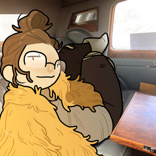 Description: A photo of the inside of an antique car’s back seat. It has blue leather interiors and wood accents. One wood tray is down. An illustration of myself in a fuzzy yellow sweater is lying across the back seat.