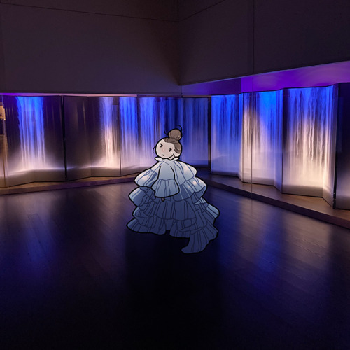 Description: A photo of the Senju piece by Ando Tadao. It’s a darkened room with panels lining the wall. Lights in violet/blue and pale pink are projected against he panels. An illustration of myself, wearing a fluffy blue dress looks back at the camera.