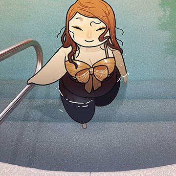 Description: A photo of the stairs leading into a pool. An illustration of myself is coming out of the water. I am wearing swim pants and a gold bikini top with a bow in front.