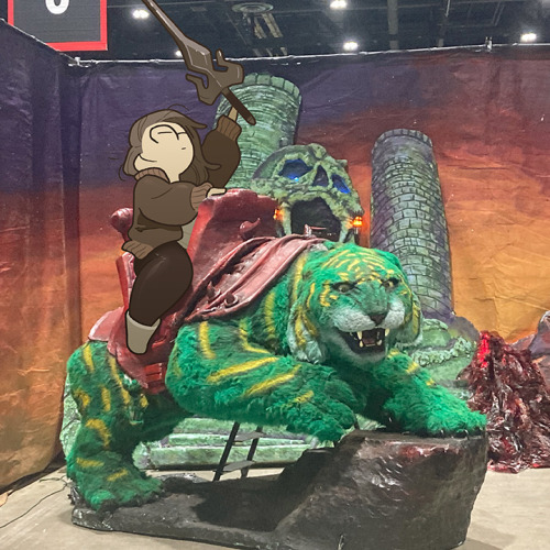Description: A photo from C2E2. It is a small HE-MAN photo op with a painted backdrop and a life sized Battle Cat. An illustration of myself sits in the saddle holding up He-Man’s sword stoically.