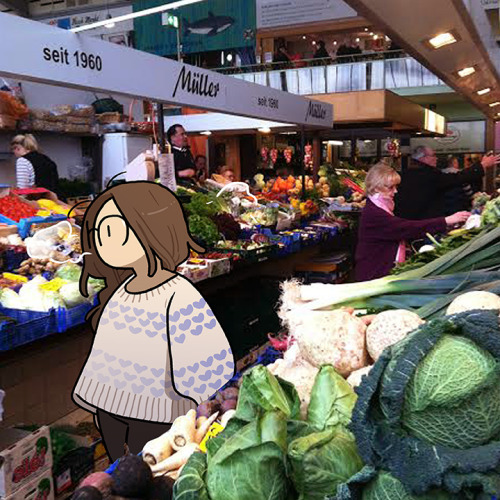 Description: A photo of a farmer’s market in Germany. An illustration of myself peruses the aisles. I am wearing a white knitted sweater with little blue hearts on it.