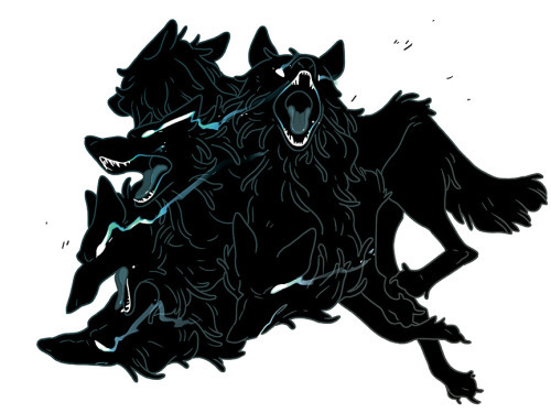 Description: An illustration of a many headed black wolf. Each head is looking it’s own way with it’s teeth ready. Each eye is white, and blurs against it’s fur in white and cyan.