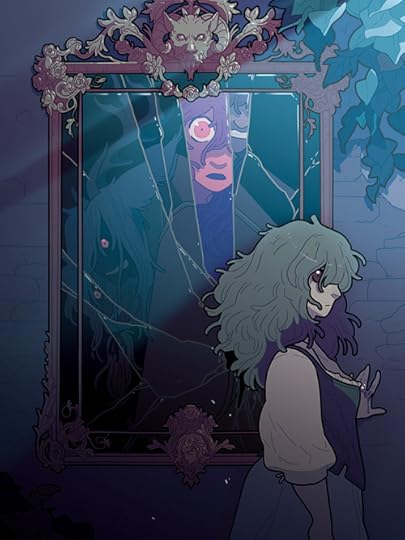 Description: An illustration of a woman standing in front of a broken mirror against a stone wall. There is ivy creeping along the corners. In the splintered mirror there are two figures, her, and a beast. She is looking at the camera from the side of her face. It’s dark, with moonlight drifting in.