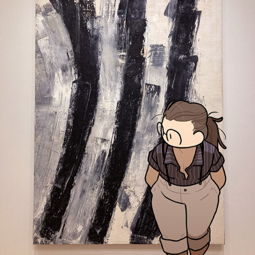 Description: A photo of the painting IRON SHARPENS IRON by Louise Fishman (1993), in the Art Institute of Chicago. It’s a white canvas with three bold lines curving from the top to the bottom. Some grey strokes fill the space between lines. An illustration of myself stands in front of the painting in white paints, a black and white striped shirt, and suspenders.
