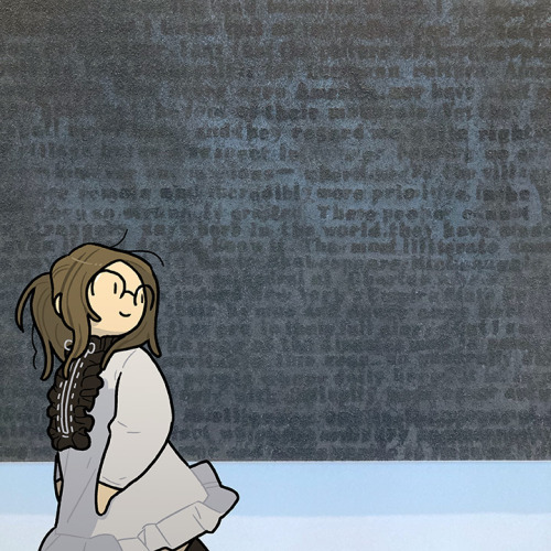 Description: A photo of STRANGER IN THE VILLAGE #13 by Glenn Ligon (1998). An illustration of myself walks past in a short grey dress with black lacing along the center.