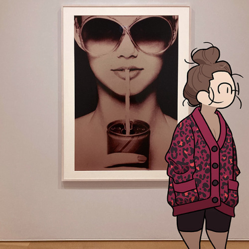 Description: A photo of an art piece by Richard Prince. It depicts a woman in shades drinking soda with a straw in black and white. An illustration of myself stands in front of the piece. I’m wearing black leggings and a long red cardigan. The cardigan is patterned like jaguar spots with small bits of pink.