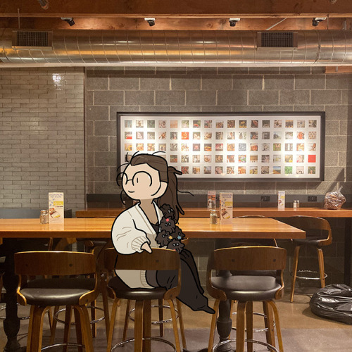 Description: A photo in a small cafe area of a bakery. An illustration of myself sits on a bar stool. I’m wearing the Susuwatari cardigan from the Spirited Away Loewe collection.