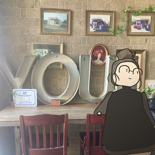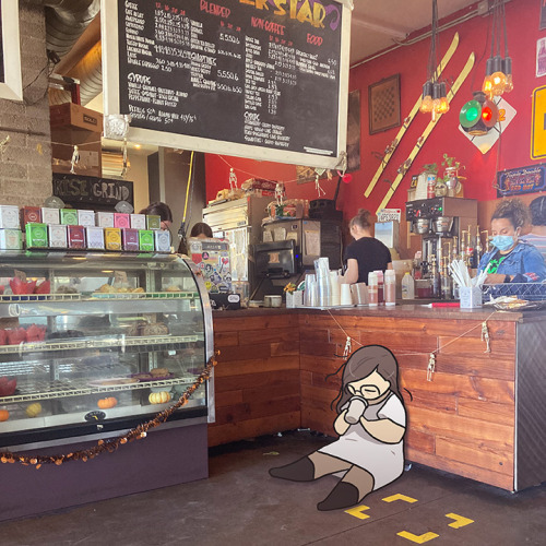 Description: A photo of a cafe counter. An illustration of myself sits on the floor leaning against the counter, sipping my drink.