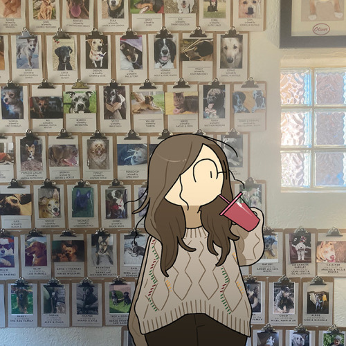 Description: An illustration of myself stand in front of a wall of pictures. I am sipping a smoothie.