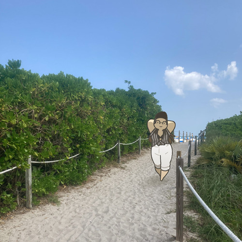 Description: A photo of a sandy path, leading up to a beach. An illustration of myself is walking down the path in a striped blouse and white pants.