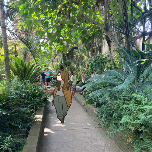 Description: A photo of the interior of the Balboa green house. An illustration of myself walks along the path, looking at the trees.