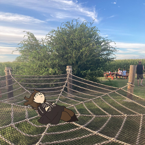 Description: A photo of a large hammock, shaped like a giant spiderweb. I sleep in the center.
